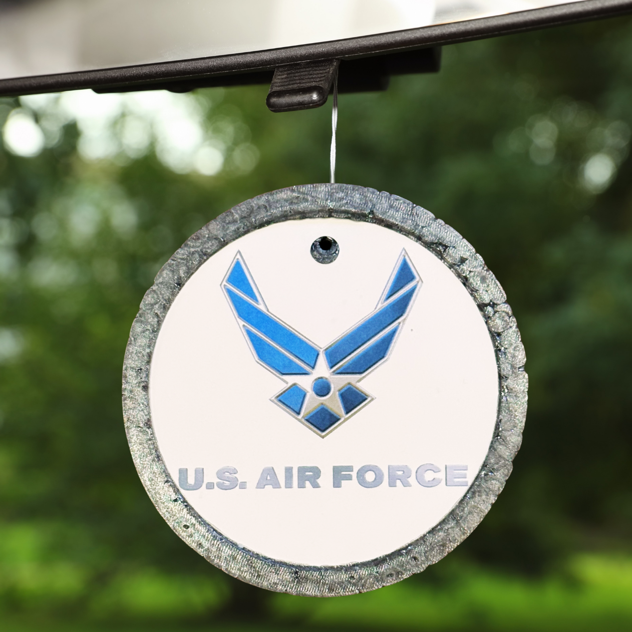 Show your support with this sleek U.S. Air Force car freshener, featuring the iconic emblem and a refreshing scent!