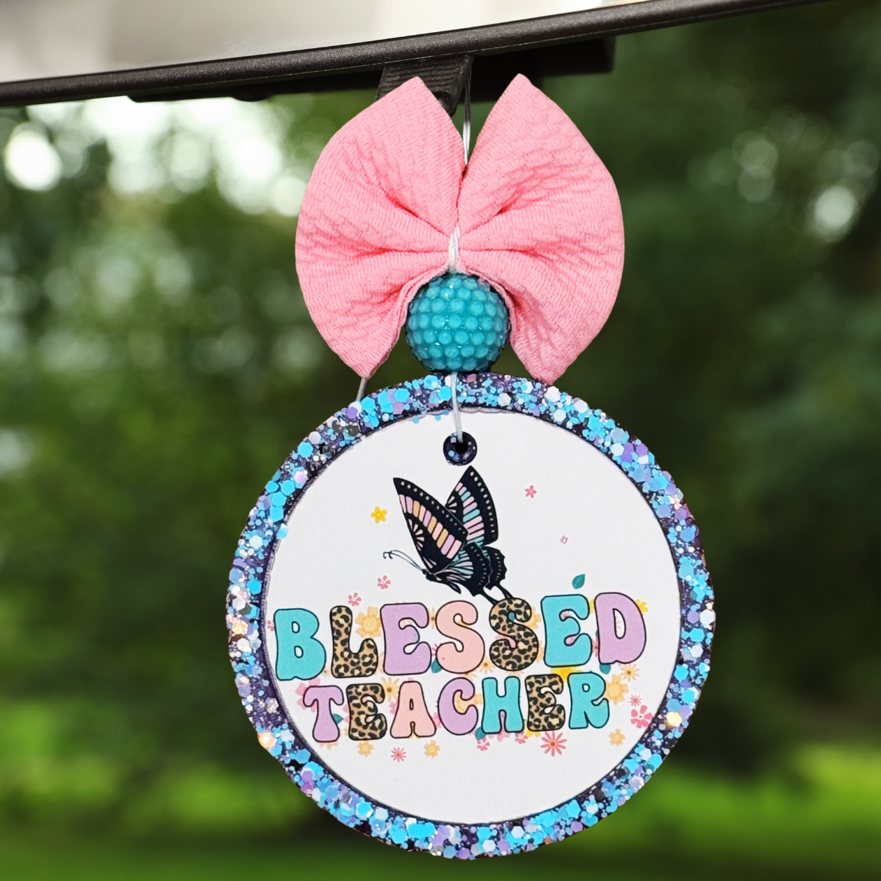 Enhance your car freshener with a sparkling glitter border, beads, bows, all perfectly coordinated to match the colors in the design.
