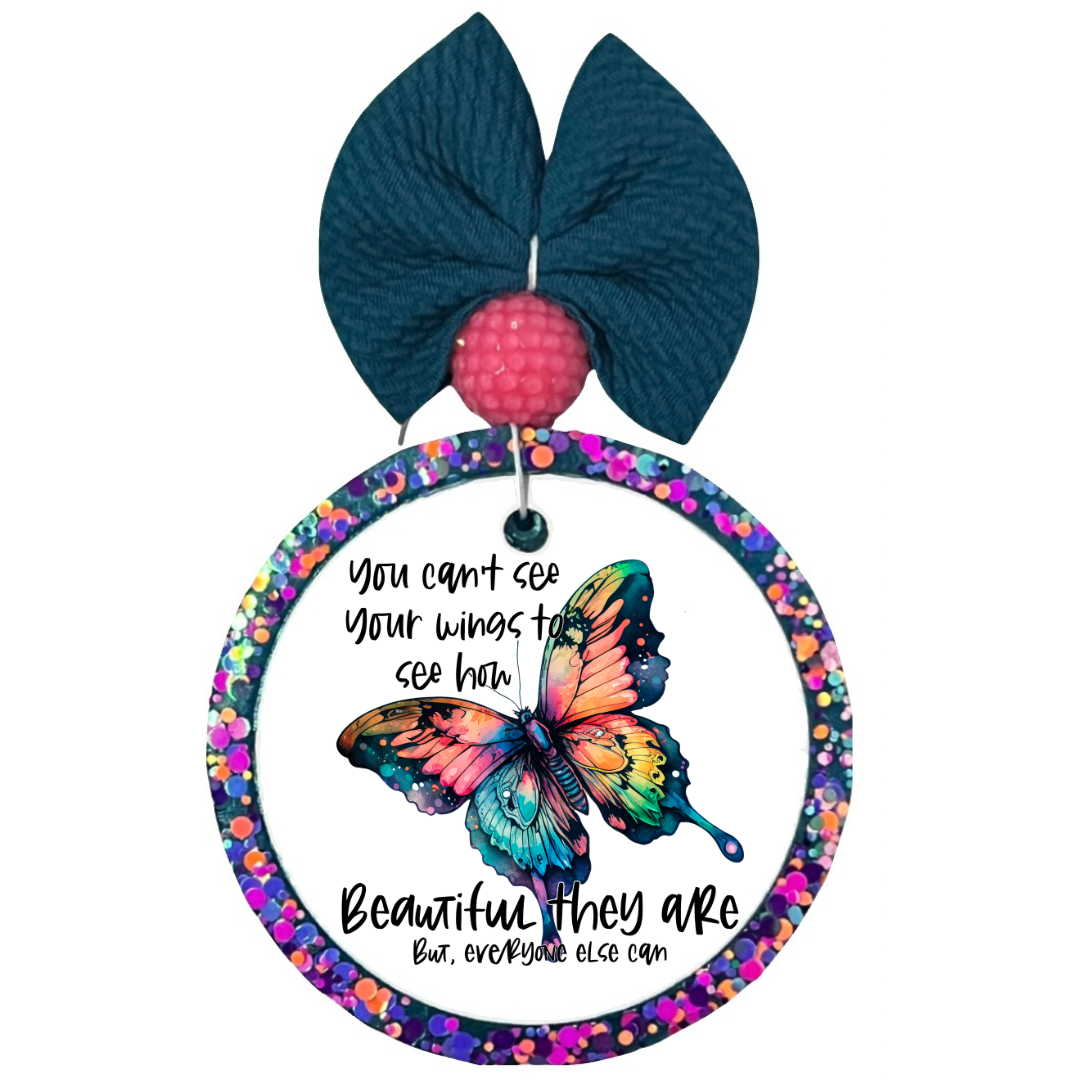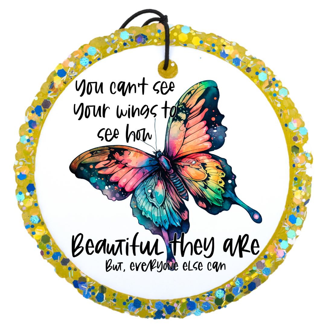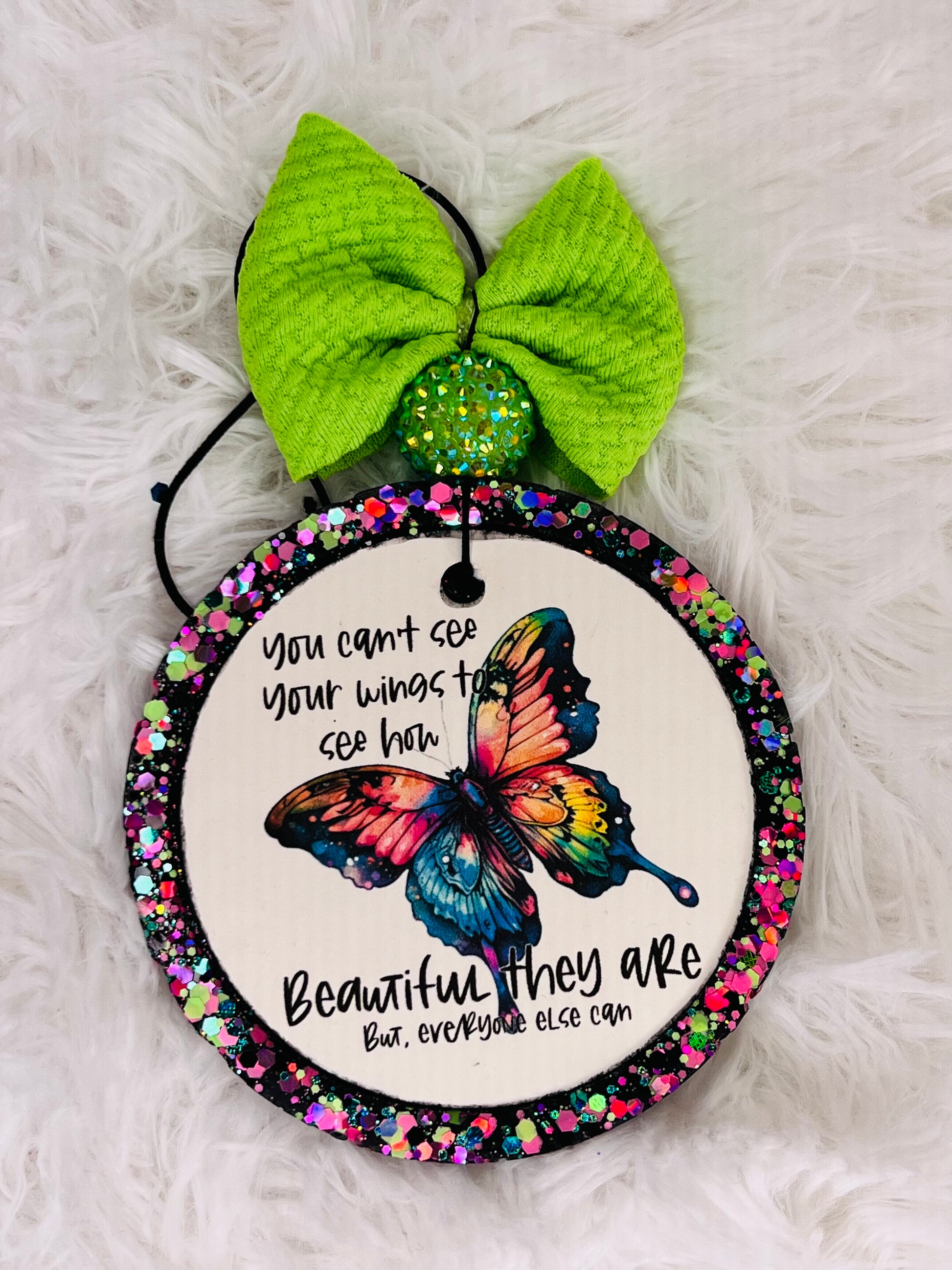 Celebrate your inner beauty with our 'Butterfly w/ Inspirational Quote' air freshener. This beautifully designed air freshener not only enhances your space with a delightful fragrance but also serves as a daily affirmation of your worth.