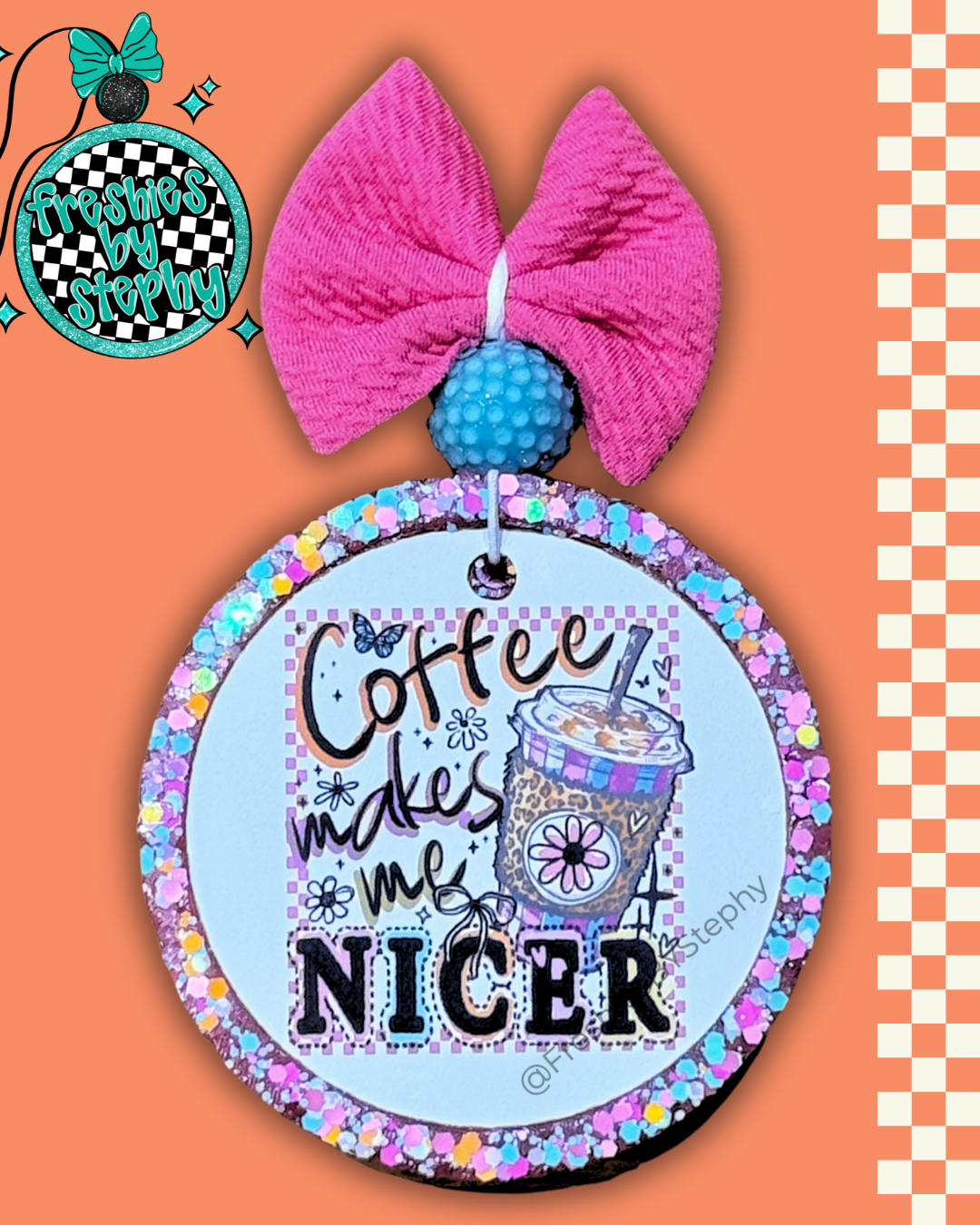 Fact: Coffee is basically a personality supplement. This handmade freshie features the honest truth “Coffee Makes Me Nicer” with an adorable leopard-print iced coffee cup, flowers, butterflies, and dazzling glitter frame.