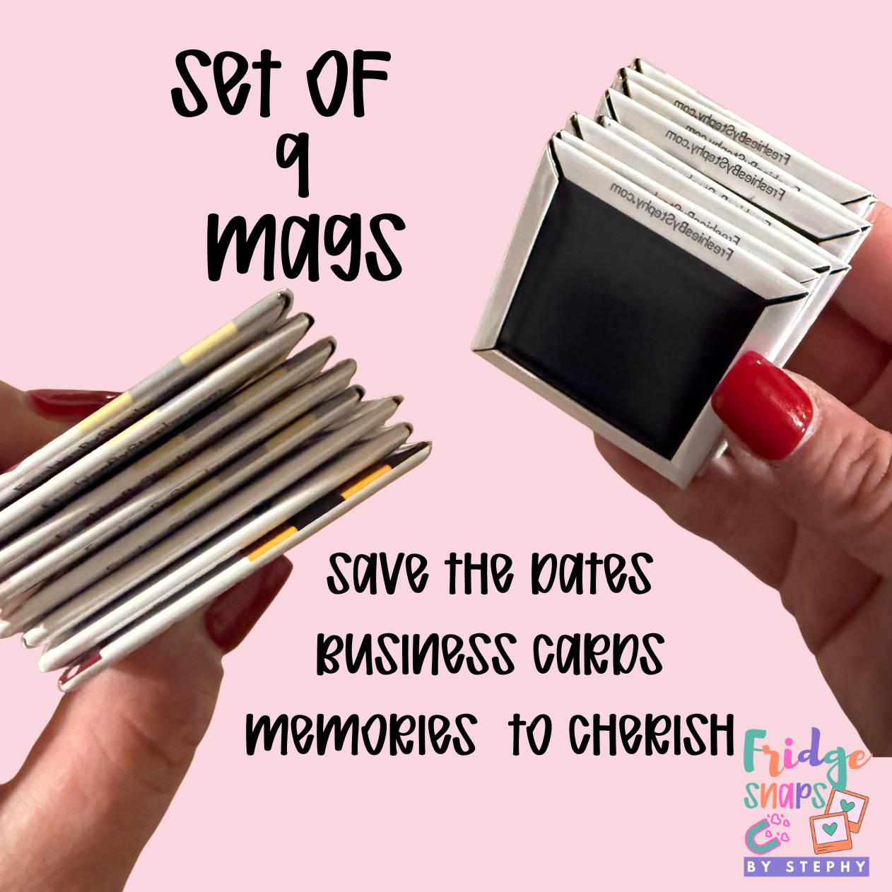 Capture your favorite moments with this set of NINE 2x2 inch custom photo magnets.