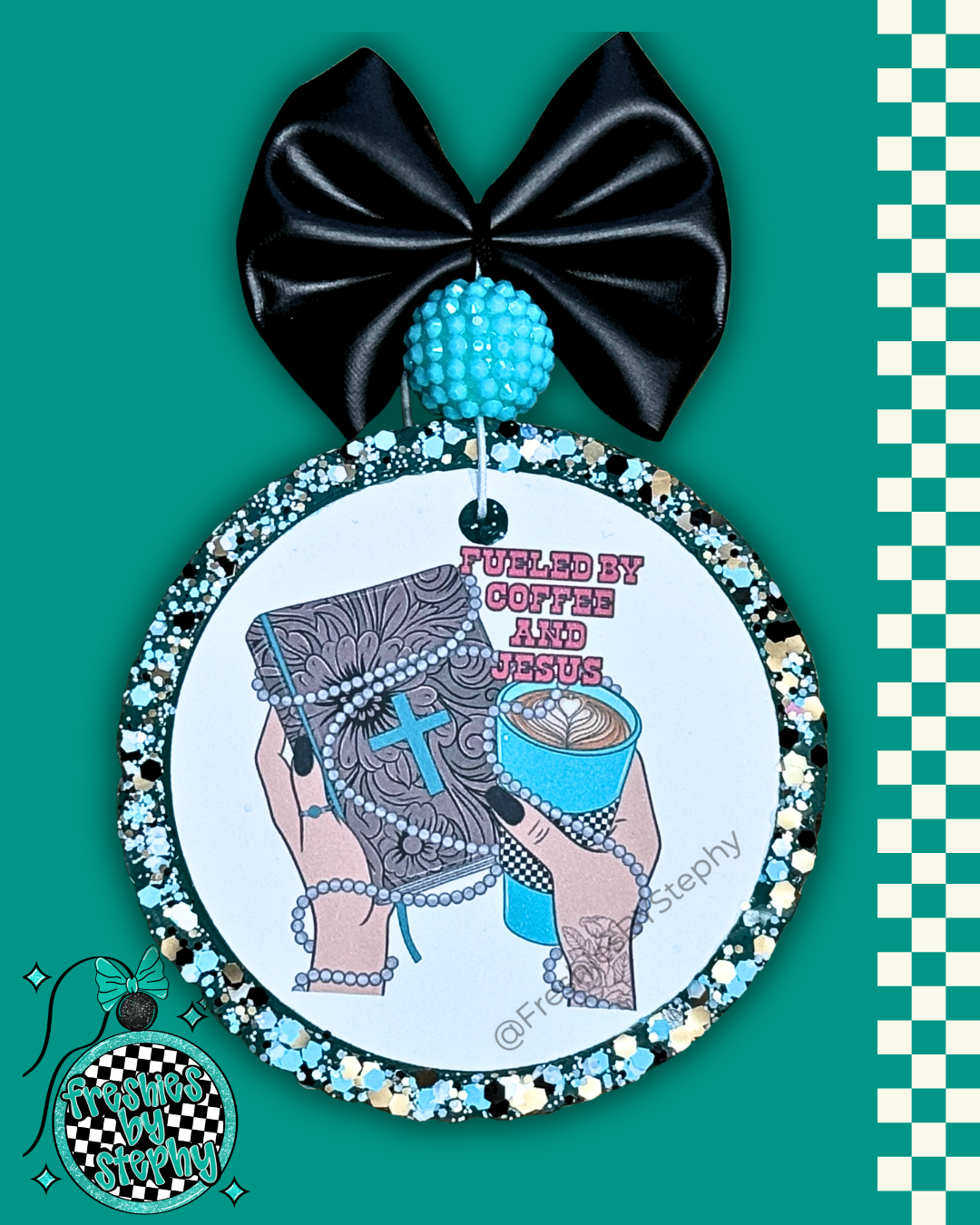 Start your day the right way with this heartfelt handmade freshie! Showcasing a stunning illustration of a bible wrapped in pearls, a cross, and a cozy coffee cup with the empowering line “Fueled by Coffee and Jesus”.