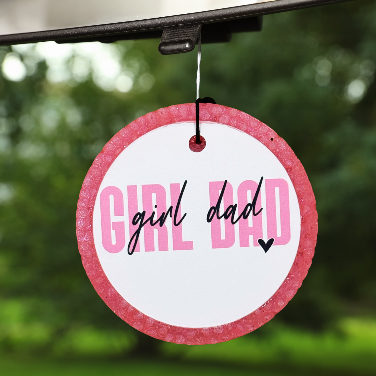 Show off your proud "Girl Dad" status with this charming Freshie! Featuring a sweet heart detail and a vibrant pink design, this car air freshener brings a delightful scent and a touch of love to your ride. Perfect for dads who adore their daughters and want to keep their vehicle smelling fresh!