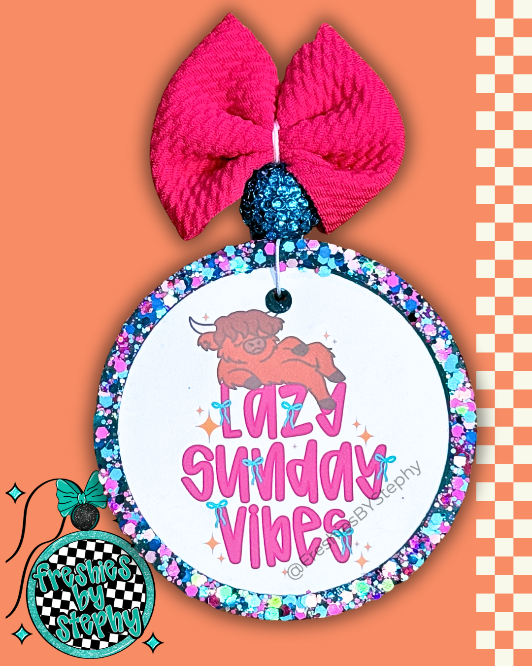 Nothing says weekend like this chill handmade freshie! Featuring a cute, lounging highland cow with the relaxed phrase “Lazy Sunday Vibes” surrounded by bows and sparkling glitter.