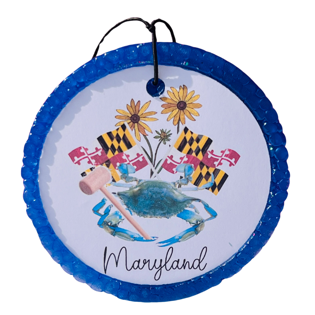 Show off your Maryland pride with our 'Maryland' Freshie featuring a Maryland blue crab and the iconic state flag design! Handmade from aroma beads and available in a variety of scents, this 3.5-inch air freshener celebrates the beauty and spirit of the Old Line State. Customize your scent choice and decorative elements to create a personalized ode to Maryland's rich heritage.