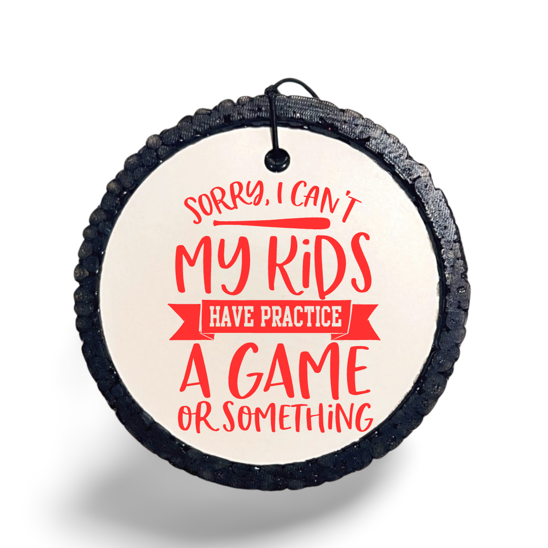 Spruce up your car with our hilarious air freshener that says 'Sorry, I can't... My kids have practice, a game or something.' Perfect for busy parents on the go!