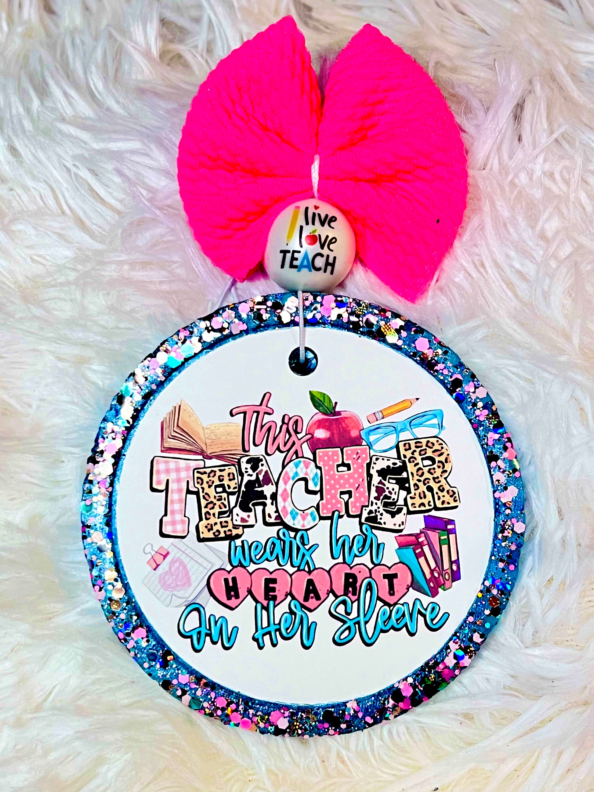 Celebrate the dedication and warmth of your favorite educator with this "This Teacher Wears Her Heart On Her Sleeve" car freshener. Designed to remind teachers of their heartfelt impact every day, it keeps their car smelling fresh while displaying a meaningful message.