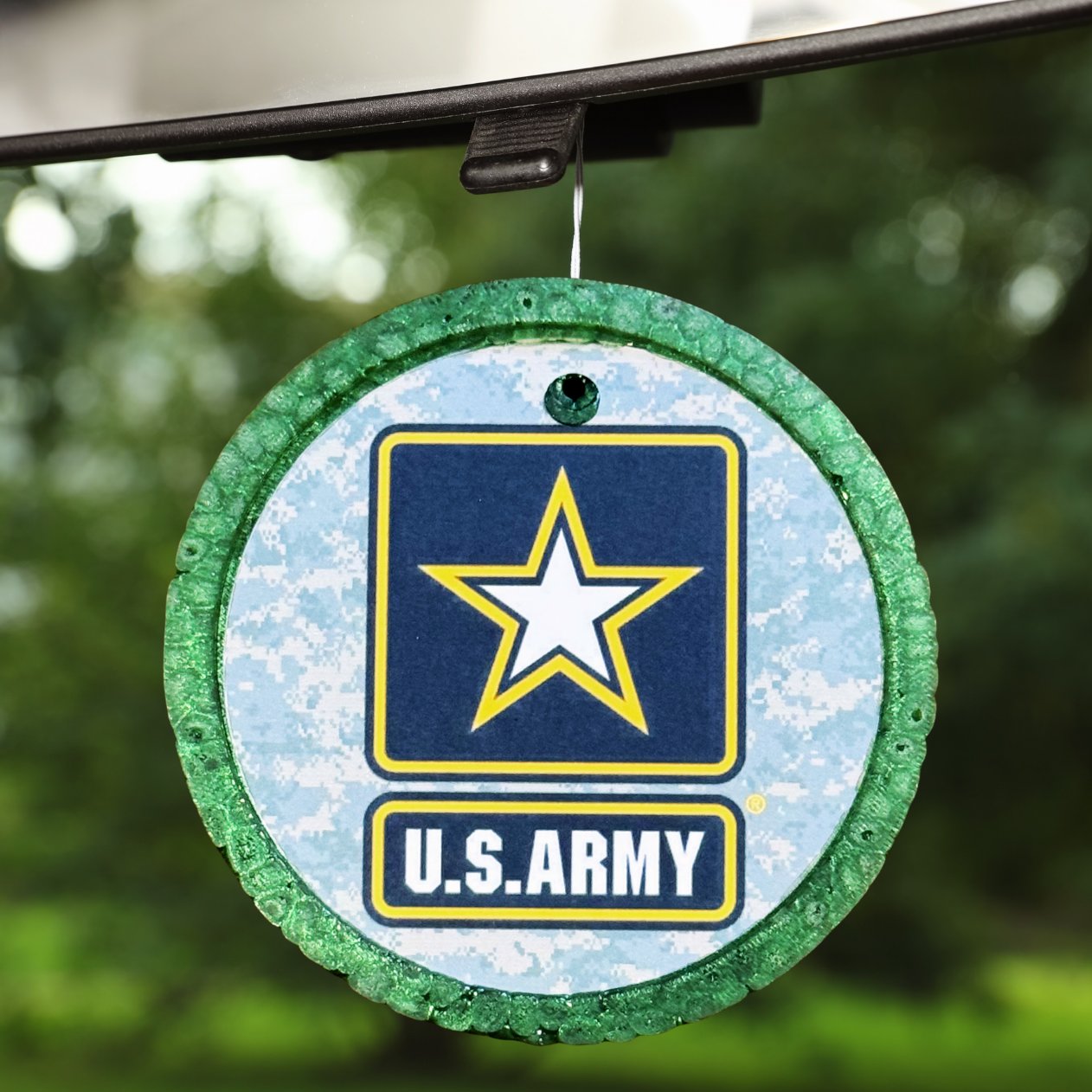 Show your Army pride with this camo-patterned car freshener, featuring the official U.S. Army emblem and a fresh scent!