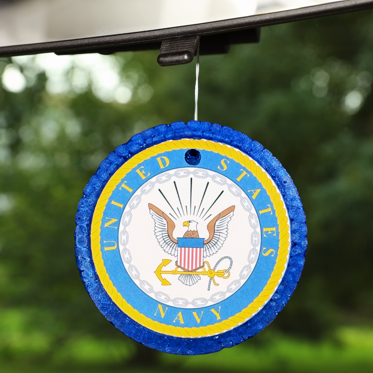 Honor the Navy with this bold car freshener featuring the official emblem and a refreshing scent!