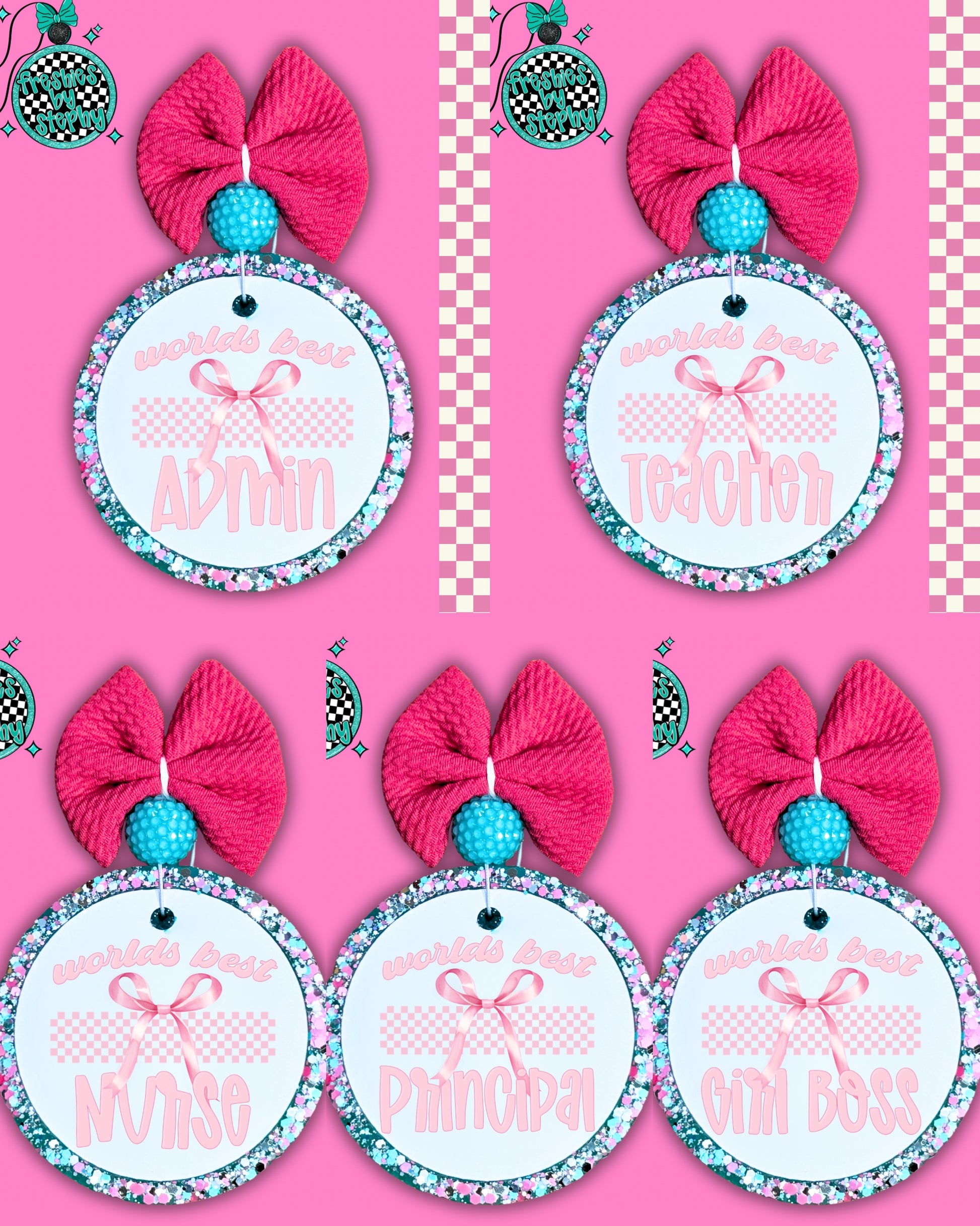 This handmade car air freshener features a coquette, sparkling glitter trim, and a custom occupation title of your choice. Making it a meaningful and eye-catching gift she’ll love.